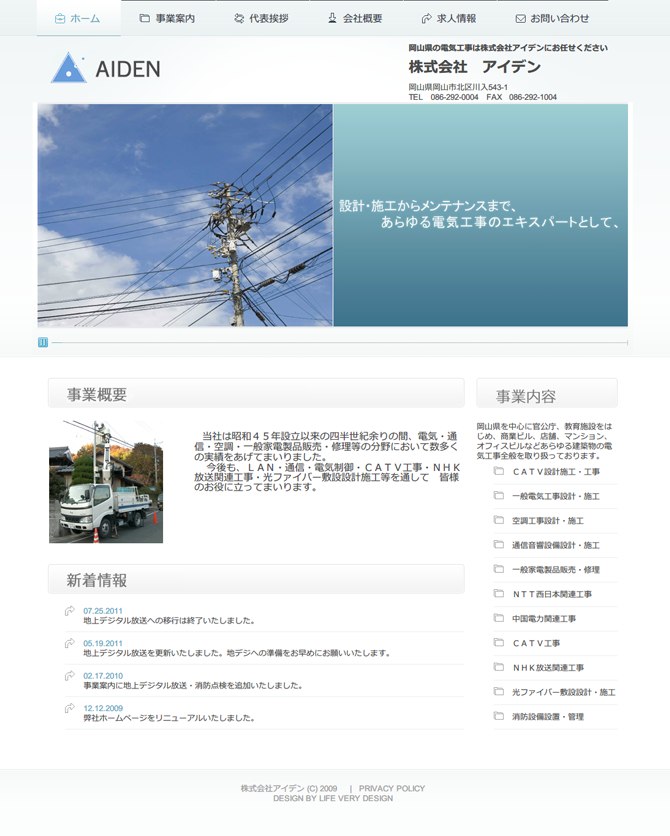 クライアント: 株式会社アイデン 様 カテゴリ: ウェブデザイン 岡山市にある株式会社アイデン様の会社ホームページを作成いたしました。 Project navigationPreviousPrevious project:真庭市勝山健康増進施設水夢 様NextNext project:岡山県三咲町の棚田