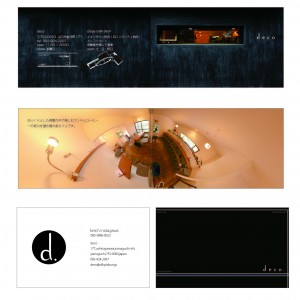 クライアント: cafe DECO 様 カテゴリ: グラフィックデザイン・360°パノラマVR 山口市にあるcafe DECO 様の名刺・ショップカード・メニューボード・360°パノラマVRを作成いたしました。 Project navigationPreviousPrevious project:有限会社ソフトロジック 様NextNext project:Garson 様