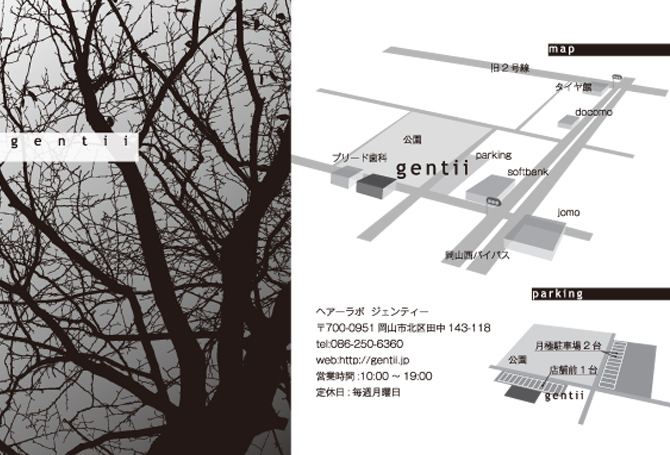 岡山市にあるヘアーラボ ジェンティー様の名刺・ポイントカード・オープニング用のダイレクトメールを作成いたしました。